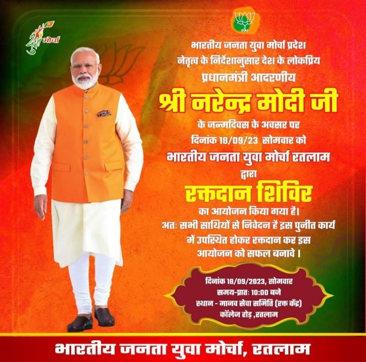 भारतीय जनता युवा मोर्चा जिला महामंत्री रविंद्र पाटीदार में जानकारी देते हुए बताया कि पीएम नरेंद्र मोदी के जन्मदिन पर युवा मोर्चा द्वारा रक्तदान शिविर का आयोजन किया गया है। जिसमे महामंत्री रविंद्र पाटीदार ने सभी मंडलों के युवाओं और पदाधिकारी से अनुरोध किया कि वह सोमवार सुबह 10बजे कॉलेज रोड स्थित मानव सेवा समिति (ब्लड बैंक) में रक्तदान शिविर में जाकर रक्तदान कर पुण्य के भागी बनें।