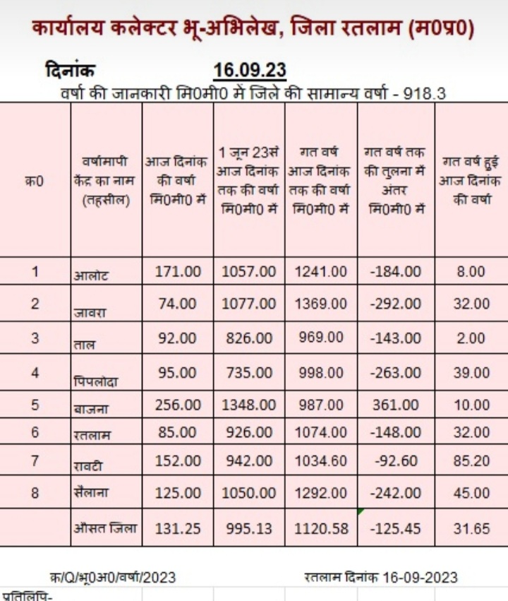 सीजन में अभी तक हुई कल बारिश की बात करें तो रतलाम विकासखंड में शनिवार सुबह तक 37 इंच बारिश दर्ज की जा चुकी है। आलोट में 42 इंच, जावरा में 43 इंच, ताल में 33 इंच, पिपलोदा में 29 इंच, भाई ना में 54 इंच, रावटी में 37.5 इंच और सैलाना में 42 इंच बारिश दर्ज की जा चुकी है।