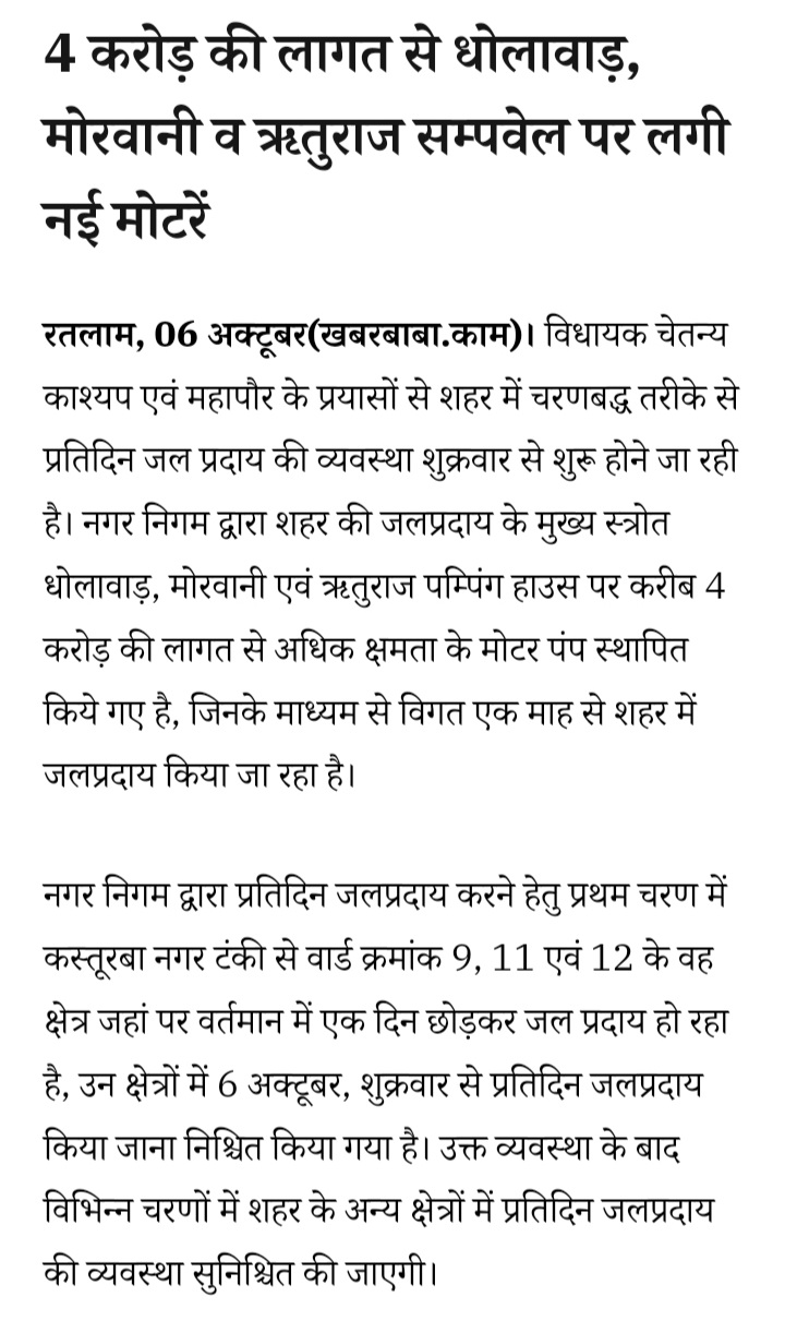 रतलाम: कस्तुरबा नगर टंकी से शहर के वार्ड क्र. 9, 11 एवं 12 के चयनित क्षेत्रों को सौगात, आज से प्रतिदिन जलप्रदाय व्यवस्था की हुई  शुरूआत