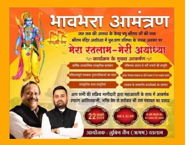 मप्र के कैबिनेट मंत्री चेतन्य काश्यप और आयोजक जुबिन जैन ने मेरा रतलाम मेरी अयोध्या कार्यक्रम में ज्यादा से ज्यादा की संख्या भाग लेने की अपील नगरवासियों से की है। दोनों ने बताया कि यह विश्व में फैले सनातन धर्म के सभी अनुयायियों के लिए गर्व का क्षण है। 22 जनवरी का दिन ऐतिहासिक है। इस दिन प्रधानमंत्री नरेंद्र मोदी अयोध्या धाम में भगवान श्री राम की मूर्ति की प्राण प्रतिष्ठा करेंगे। ऐसा आनंद का क्षण 500 वर्षों के बाद आया है।
