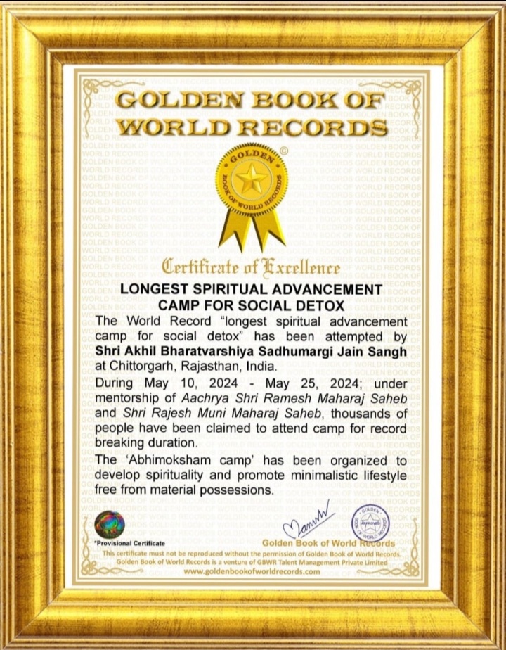 रतलाम, 29मई (खबरबाबा.काम)। श्री अखिल भारतीय साधुमार्गी जैन संघ द्वारा आचार्य श्री रामलाल जी म.सा. एवं उपाध्याय प्रवर राजेश मुनि जी महाराज साहब के पावन सानिध्य में चित्तौड़ राजस्थान मे लगे 16 दिवसीय धार्मिक आवासीय शिविर को गोल्डन बुक ऑफ़ वर्ल्ड रिकॉर्ड से पुरस्कार किया गया है।