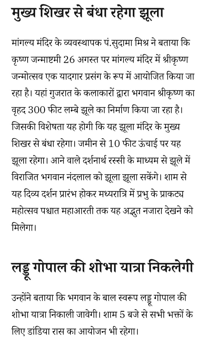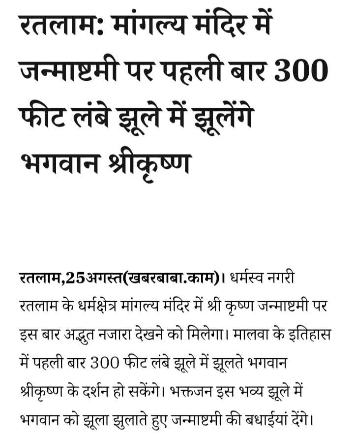 रतलाम रतलाम: मांगल्य मंदिर में जन्माष्टमी पर पहली बार 300 फीट लंबे झूले में झूलेंगे भगवान श्रीकृष्ण Last updated: August 25, 2024 12:00 am By indresh98kumar@gmail.comByindresh98kumar@gmail.com Share 0 Min Read |||| SHARE Share This Article Email Copy Link Print Previous Article रतलाम: डिस्ट्रिक्ट होम्योपैथिक मेडिकल कॉलेज का बीएचएमएस चतुर्थ वर्ष का परीक्षा परिणाम सर्वश्रेष्ठ, पीयूष राठौड़, तितिक्षा पांडेय व प्राची बेन पटेल को उल्लेखनीय सफलता Next Article रतलाम: 10 माह की बच्ची का अपहरण कर क्यों की हत्या, पुलिस आज दोपहर में करेगी खुलासा… आरोपी को किया गिरफ्तार Leave a Comment Leave a Reply Cancel replyYour email address will not be published. Required fields are marked *Comment * Name * Email * Website Save my name, email, and website in this browser for the next time I comment. FacebookLikeXFollowInstagramFollowLinkedInFollowMediumFollowRSS FeedFollow Subscribe to our newsletter to get our newest articles instantly![mc4wp_form] Most Read एमएसएमई मंत्री चेतन्य काश्यप ने ली मेडिकल कॉलेज की समीक्षा बैठक,कहा-मरीजों को समय पर बेहतर स्वास्थ्य सुविधा मिले लापता भारतीयों का मामला: सुषमा के खिलाफ देश को गुमराह करने की शिकायत दर्ज कांग्रेस के आरोप पूरी तरह गलत, राजनीति से प्रेरित: नायडू डी.पी. के मामले में डेढ़ मिनिट की बहस, 28 तक टली सुनवाई सेंट जोसेफ के 57 शिक्षकों से टूर कंपनी ने ठगे 15 लाख रूपए पाकिस्तान: आत्मघाती धमाके से दहला लाहौर, 26 से ज्यादा की मौत चीनी सेना की धमकी- किसी भी कीमत पर करेंगे संप्रभुता की रक्षा, सेना हटाए भारत नकली नोट पकड़ने के लिए आरबीआई ने बनाई यह योजना मुखौटै कंपनियों से सांठगांठ का आरोप, 26 चार्टेड अकाउंटेंट की जांच बैडमिंटन: यूएस ओपन के फाइनल में टकराएंगे प्रणय व कश्यप - Advertisement -