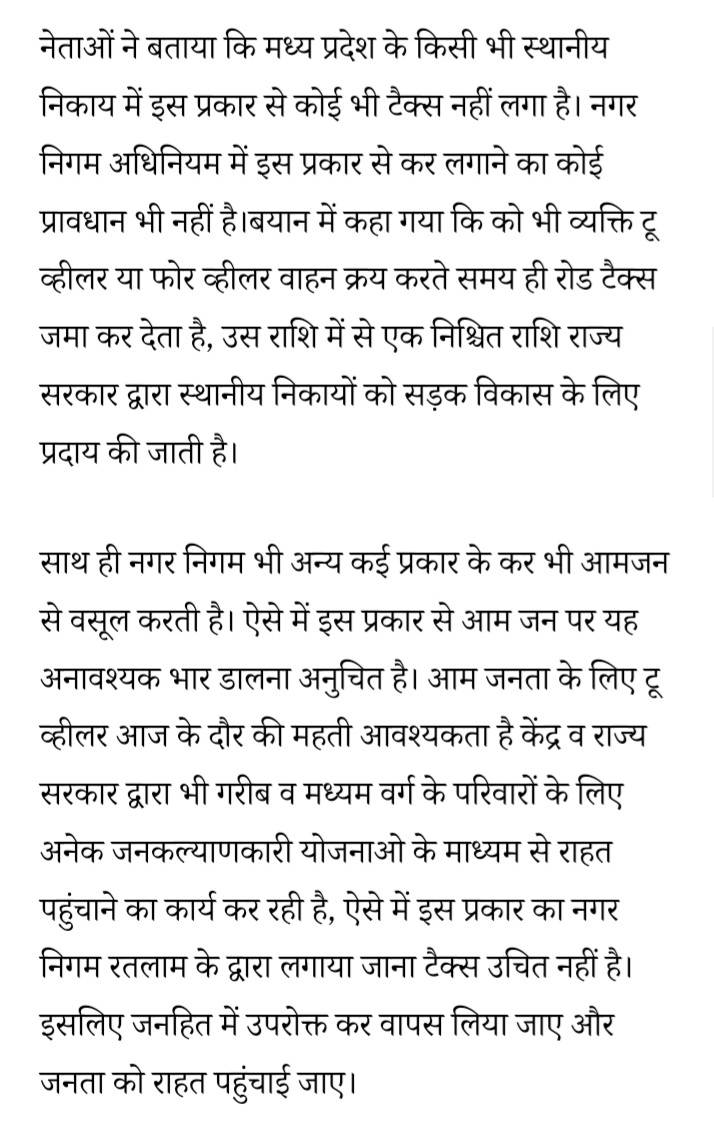 रतलाम: सड़क पर खड़े वाहनों से शुल्क वसूलने का विरोध शुरू -BJP नेताओं ने ही की वापस लेने की मांग… भाजपा के बहुमत वाली नगर निगम परिषद के सम्मेलन में वाहनों से शुल्क लेने का प्रस्ताव हुआ है पारित