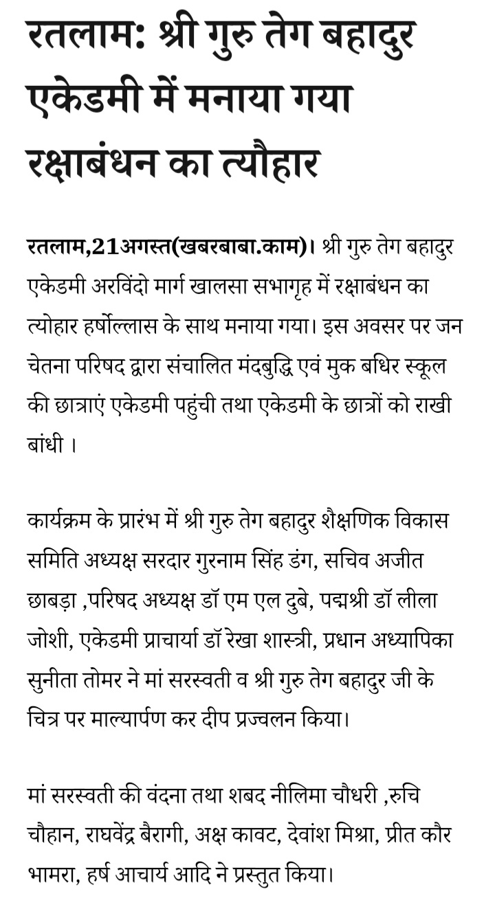 रतलाम रतलाम: श्री गुरु तेग बहादुर एकेडमी में मनाया गया रक्षाबंधन का त्यौहार Last updated: August 21, 2024 12:00 am By indresh98kumar@gmail.comByindresh98kumar@gmail.com Share 0 Min Read ||||| SHARE Share This Article Email Copy Link Print Previous Article रतलाम: बी.एड. प्रवेश हेतु ऑनलाइन काउंसलिंग का द्वितीय अतिरिक्त चरण शुरू Next Article रतलाम: स्कूल के कार्यक्रम में पाकिस्तान का झंडा फहराने पर अखिल भारतीय विद्यार्थी परिषद ने चक्का जाम कर किया प्रदर्शन, सख्त कार्रवाई की मांग Leave a Comment Leave a Reply Cancel replyYour email address will not be published. Required fields are marked *Comment * Name * Email * Website Save my name, email, and website in this browser for the next time I comment. FacebookLikeXFollowInstagramFollowLinkedInFollowMediumFollowRSS FeedFollow Subscribe to our newsletter to get our newest articles instantly![mc4wp_form] Most Read एमएसएमई मंत्री चेतन्य काश्यप ने ली मेडिकल कॉलेज की समीक्षा बैठक,कहा-मरीजों को समय पर बेहतर स्वास्थ्य सुविधा मिले लापता भारतीयों का मामला: सुषमा के खिलाफ देश को गुमराह करने की शिकायत दर्ज कांग्रेस के आरोप पूरी तरह गलत, राजनीति से प्रेरित: नायडू डी.पी. के मामले में डेढ़ मिनिट की बहस, 28 तक टली सुनवाई सेंट जोसेफ के 57 शिक्षकों से टूर कंपनी ने ठगे 15 लाख रूपए पाकिस्तान: आत्मघाती धमाके से दहला लाहौर, 26 से ज्यादा की मौत चीनी सेना की धमकी- किसी भी कीमत पर करेंगे संप्रभुता की रक्षा, सेना हटाए भारत नकली नोट पकड़ने के लिए आरबीआई ने बनाई यह योजना मुखौटै कंपनियों से सांठगांठ का आरोप, 26 चार्टेड अकाउंटेंट की जांच बैडमिंटन: यूएस ओपन के फाइनल में टकराएंगे प्रणय व कश्यप - Advertisement -