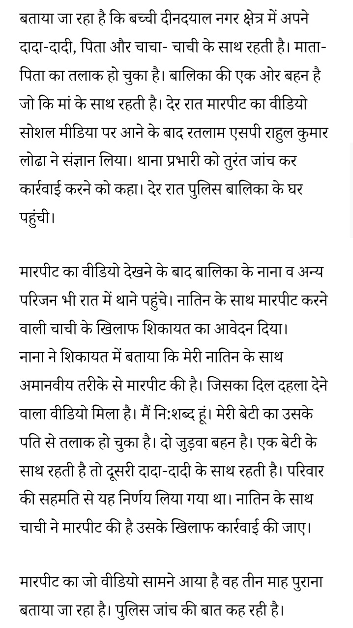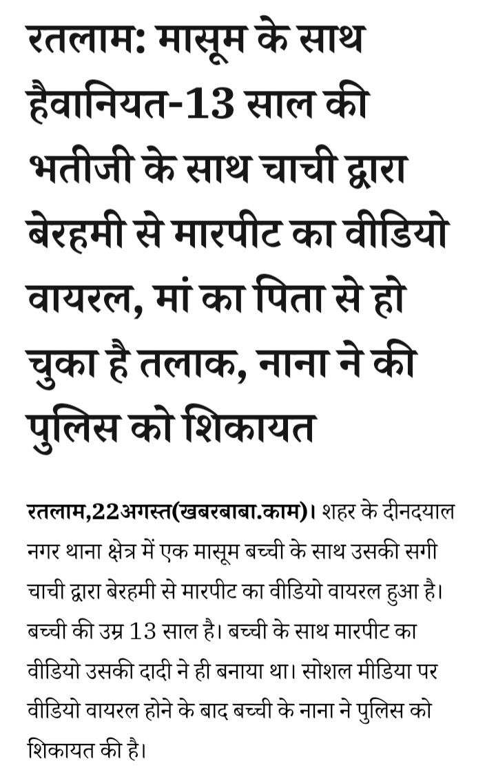 रतलाम रतलाम: मासूम के साथ हैवानियत-13 साल की भतीजी के साथ चाची द्वारा बेरहमी से मारपीट का वीडियो वायरल, मां का पिता से हो चुका है तलाक, नाना ने की पुलिस को शिकायत Last updated: August 22, 2024 12:00 am By indresh98kumar@gmail.comByindresh98kumar@gmail.com Share 0 Min Read | SHARE Share This Article Email Copy Link Print Previous Article रतलाम: स्कूल के कार्यक्रम में पाकिस्तान का झंडा फहराने पर अखिल भारतीय विद्यार्थी परिषद ने चक्का जाम कर किया प्रदर्शन, सख्त कार्रवाई की मांग Next Article रतलाम: पीयूष पटवा व प्रतीक पटवा के मासश्रमण की तपस्या पूर्ण Leave a Comment Leave a Reply Cancel replyYour email address will not be published. Required fields are marked *Comment * Name * Email * Website Save my name, email, and website in this browser for the next time I comment. FacebookLikeXFollowInstagramFollowLinkedInFollowMediumFollowRSS FeedFollow Subscribe to our newsletter to get our newest articles instantly![mc4wp_form] Most Read Hello world! War-Torn Nation Begins Reconstruction Efforts with International Aid Why We Need More Women in Leadership Positions एमएसएमई मंत्री चेतन्य काश्यप ने ली मेडिकल कॉलेज की समीक्षा बैठक,कहा-मरीजों को समय पर बेहतर स्वास्थ्य सुविधा मिले Rebels Claim Victory After Overrunning Key Government Military Base Leaders from Rival Factions Agree to Historic Peace Talks After Years of Conflict Peace Talks Fail as Tensions Escalate Between Rival Nations New Political Party Wins Major Victory in High-Stakes Election U.S. Senate Passes $1.5 Trillion Gov’t Funding Bill with Ukraine लापता भारतीयों का मामला: सुषमा के खिलाफ देश को गुमराह करने की शिकायत दर्ज - Advertisement -