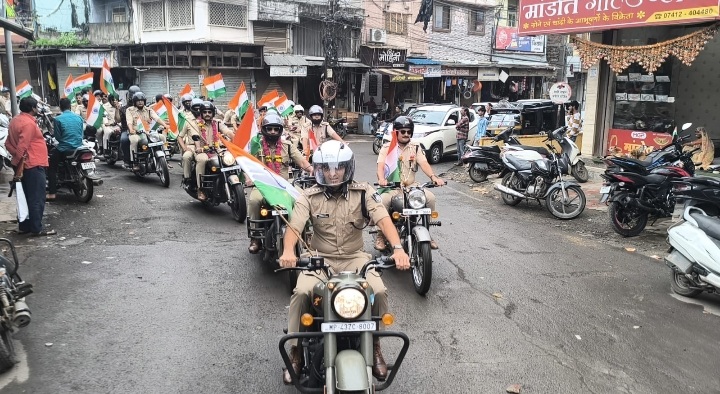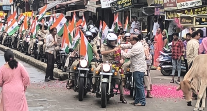 रतलाम,12अगस्त(खबरबाबा.काम)। आजादी के महापर्व 15 अगस्त के अवसर पर आज रतलाम पुलिस द्वारा तिरंगा यात्रा निकाली गई। शहर के प्रमुख मार्गों से निकली तिरंगा यात्रा का आम नागरिकों ने स्वागत किया। एसपी राहुल लोढ़ा ने तिरंगा यात्रा का नेतृत्व किया। एसपी बुलेट पर आगे चल रहे थे।
