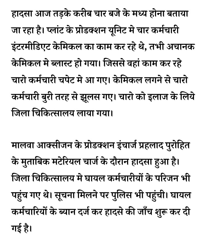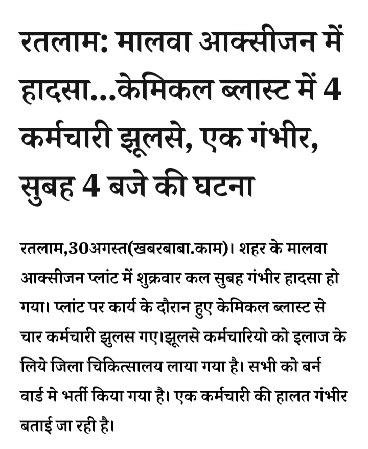 रतलाम: मालवा आक्सीजन में हादसा…केमिकल ब्लास्ट में 4 कर्मचारी झूलसे, एक गंभीर, सुबह 4 बजे की घटना