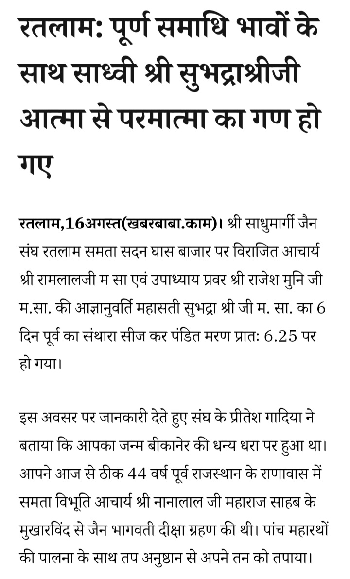 रतलाम: पूर्ण समाधि भावों के साथ साध्वी श्री सुभद्राश्रीजी आत्मा से परमात्मा का गण हो गए